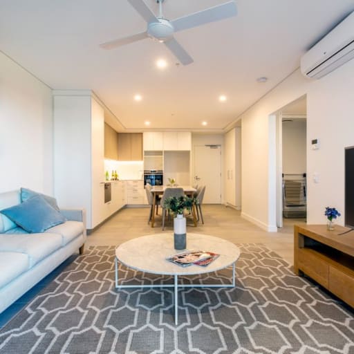 - Light and airy living area extending through kitchen to private balcony