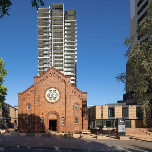 Rather than treating the tower as an isolated object, Architectus has structured the precinct as a sequence of buildings and landscapes that mediate between public and private. Along Oxford Street, the built form remains deliberately modest, deferring to the scale and presence of the church. The tower itself is positioned to the north-west, where its height aligns with the emerging density of the Cambridge Street corridor and allows the site to open up rather than overwhelm its surroundings.