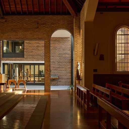 The planning of movement and access reflects this complexity. Separate entries for aged care, independent living, school and parish facilities ensure dignity, safety and clarity, while shared outdoor spaces maintain a sense of collective life. Parking has been carefully integrated, including a new parish carpark that relieves pressure on surrounding streets, and a purpose-built school drop-off zone that prioritises safety without dominating the ground plane.